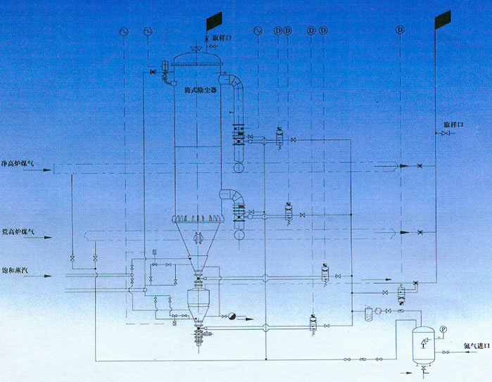 高炉煤气干法滤袋式除尘系统,适用于128-1000m³的高炉,其核心部分采用氮气脉冲反吹技术及系统自动控制技术。